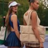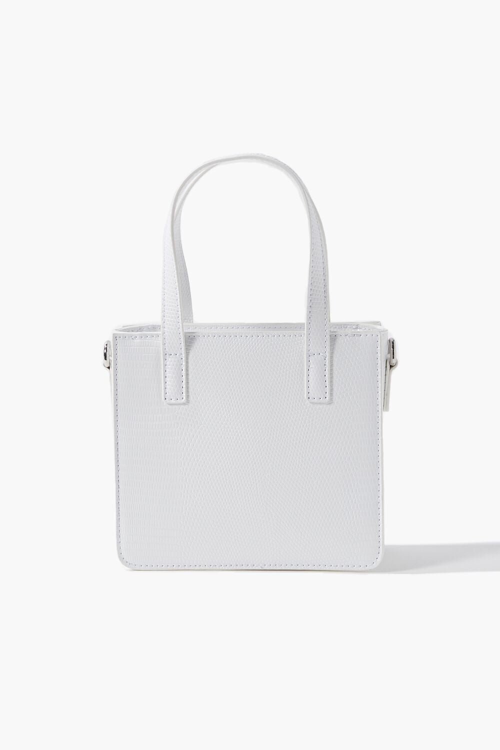 Details A faux crocodile leather tote bag featuring dual top handles, high-polish hardware, zippered top, and a removable shoulder strap with lobster-clasp closure.Size + Fit – Height: 6′ – Width: 7′ – Depth: 2.75′