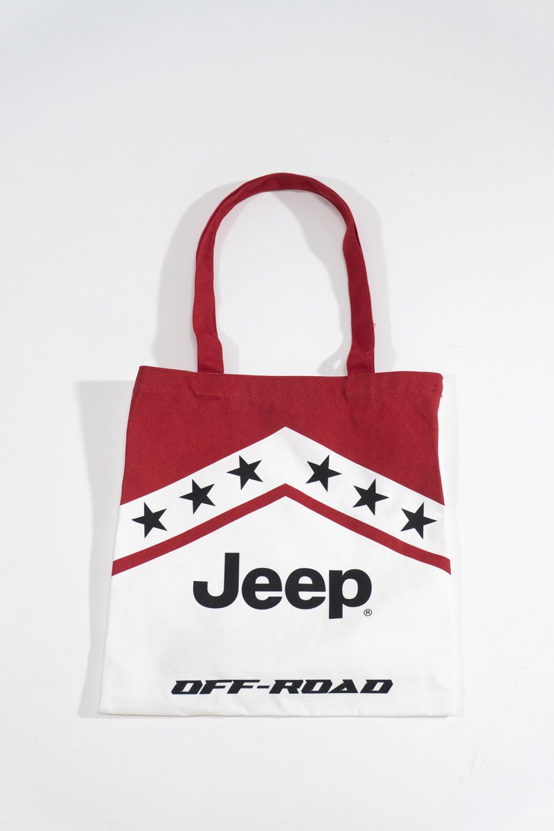 Canvas tote bag with contrasting handles Bold “Jeep” and “Off-Road” lettering on the front Star accents integrated into a V-shaped design Spacious, durable tote perfect for everyday use or travel 80% cotton, 18% polyester, 2% other fibers